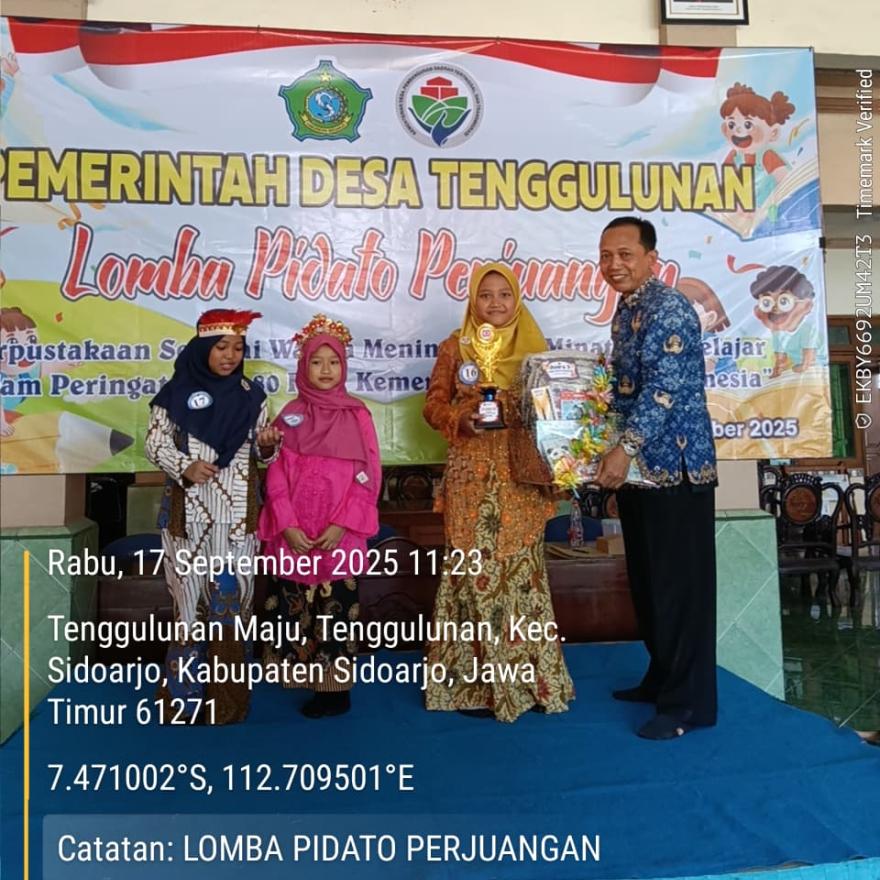 Tenggulunan - Dalam upaya meningkatkan minat baca dan kecintaan anak-anak terhadap literasi, Perpustakaan Desa Tenggulunan menggelar sebuah kegiatan istimewa berupa Lomba Pidato dengan tema “Perjuangan”. Kegiatan ini diselenggarakan pada hari Rabu, 17 September 2025 bertempat di Balai Desa Tenggulunan.